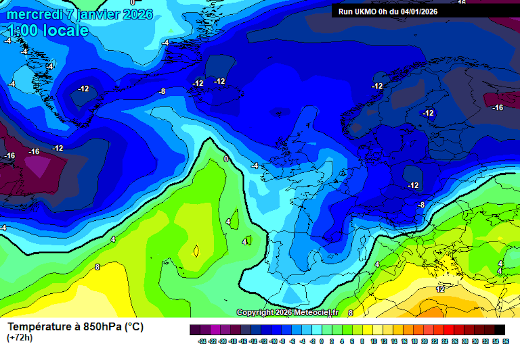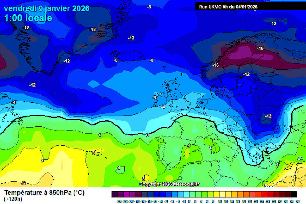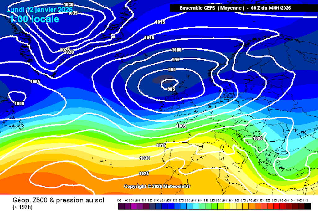 Sur l’illustration à droite ci-dessus, nous pouvons observer la progression vers l’est de l’influence maritime en provenance de l’océan Atlantique, ainsi qu’une nouvelle poussée d’air d’origine subtropicale en direction de l’Islande. Sur le flanc est de cette poussée devrait glisser un minimum dépressionnaire en phase de creusement et qui devrait, en principe, établir la jonction avec les systèmes cycloniques nord-atlantiques au sud-ouest de l’Irlande ; soit bien trop rapidement et trop au nord pour le maintien de l’air froid sur le pays.