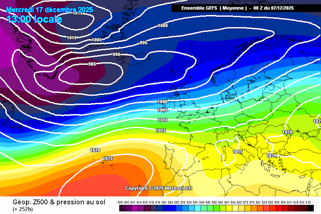 A plus long terme, soit au-delà d’une dizaine de jours, aucun changement notable de temps n’est observable pour l’instant à l’échelle de notre quadrant hémisphérique. Les basses pressions pourraient continuer à investir l’Atlantique nord et les hautes pressions se cantonner plus au sud, entre les régions tropicales et notre pays. En résumé, une situation typique de décembre et relevant d’un indice NAO (Oscillation Nord Atlantique) positif.