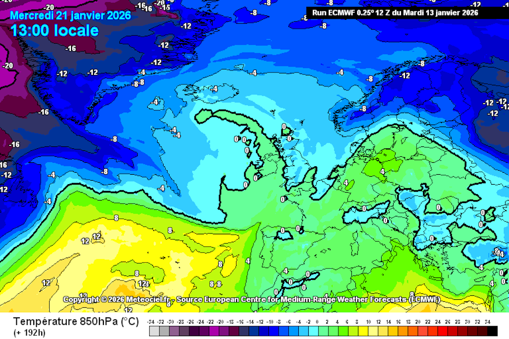 Notre région se trouve au carrefour de toutes ces influences (talwegs en provenance de l’océan Atlantique, dépression méditerranéenne, hautes pressions à l’est de notre pays). Dans ce contexte, l »origine des masses d’air n’y serait pas vraiment franche, mais nous pouvons noter, sur l’illustration ci-dessous, l’absence de sensations réellement hivernales en altitude, avec l’isotherme du zéro degré durablement situé au-delà des crêtes du Massif.