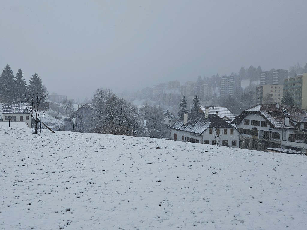 Ambiance hivernale ce dimanche matin au Locle, après les chutes de neige de la veille. Le soleil, qui a déjà retrouvé sa place dans notre ciel, bien que parfois caché par des paquets nuageux parfois nombreux et entraînés par une faible bise, devrait rapidement faire fondre la neige dans les pentes exposées; ailleurs, elle subsistera sans doute plus longtemps, mais probablement pas au-delà du milieu de la semaine prochaine.