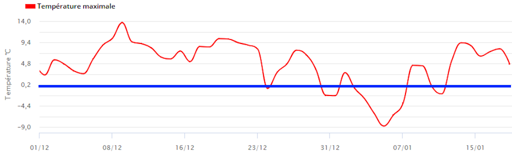 L’illustration ci-dessous résume à elle seule l’anomalie positive de température observée ici au Locle depuis le début de l’hiver météorologique.