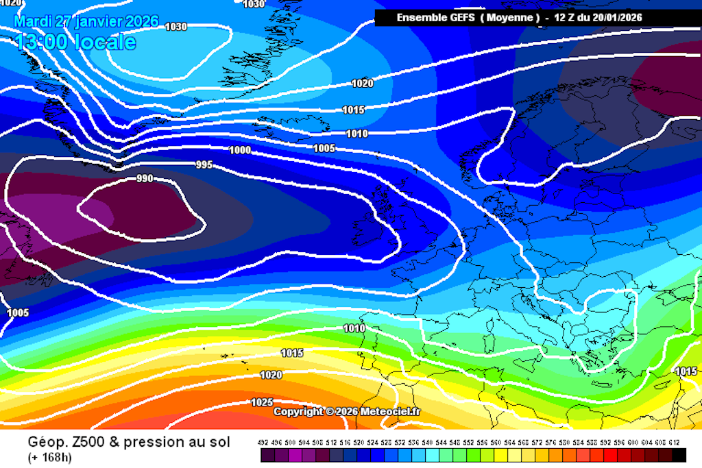 Sa trajectoire semblant être un peu plus nordique que sur les précédentes modélisations, nous pourrions nous retrouver plus franchement dans le secteur doux des perturbations, qui seraient vues beaucoup plus actives dans notre région. Dès lors, cela consisterait, dès le début de la semaine prochaine et possiblement pour plusieurs jours, à une succession d’épisodes pluvieux entrecoupés de brefs intermèdes plus frais.