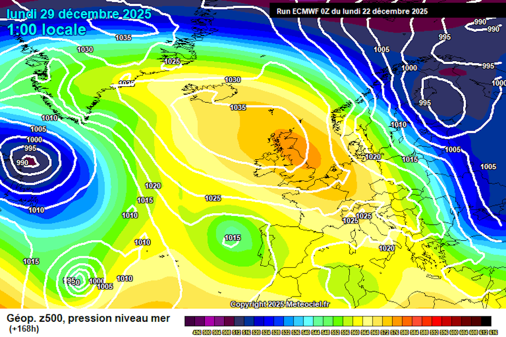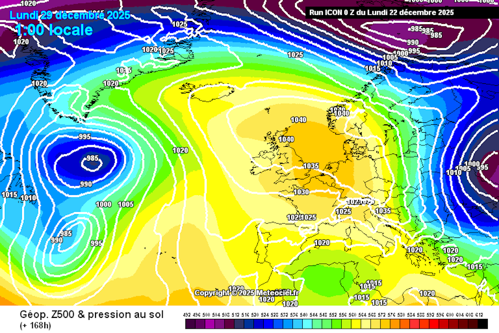 La mise à jour des modèles de prévision ne joue pas en notre faveur aujourd’hui, mais tout espoir à un retour des conditions de saison (hivernales) à court ou moyen terme n’est pas perdu pour autant. Par rapport à hier, nous constatons en effet un renforcement notable des hautes pressions sur l’Europe occidentale et centrale après le passage de la goutte froide peu avant Noël. Corolaire, le retrait hypothétique des hautes pressions à l’ouest du continent est systématiquement repoussé au-delà de 200 heures, ce qui laisse à suggérer que cette option ne peut toujours pas être raisonnablement envisagée dans une prévision météorologique, et donc qu’elle reste en l’état un scénario possible pour le début de l’année prochaine.