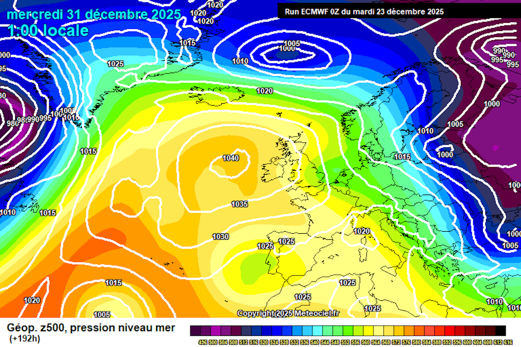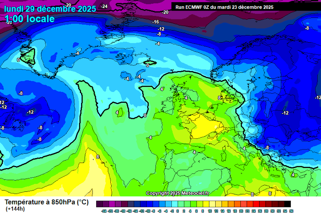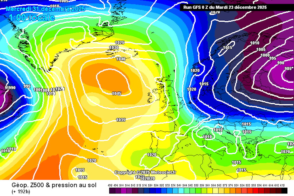 Ces divergences entraîneraient naturellement une évolution du temps différente sur notre pays à une échéance ultérieure, mais cela tient davantage de la science-fiction que d’une prévision sérieuse. S’il fallait oser un pronostic pour le temps dans notre région pour le dernier jour de l’année et le premier de la suivante, nous pourrions miser une pièce sur du temps en partie nuageux et plutôt froid, dont le potentiel humide reste encore à déterminer, avec le retour de températures négatives à 850 hPa après deux ou trois jours d’une très grande douceur.
