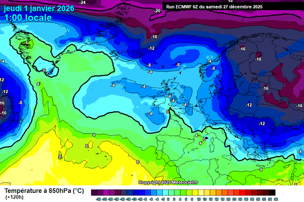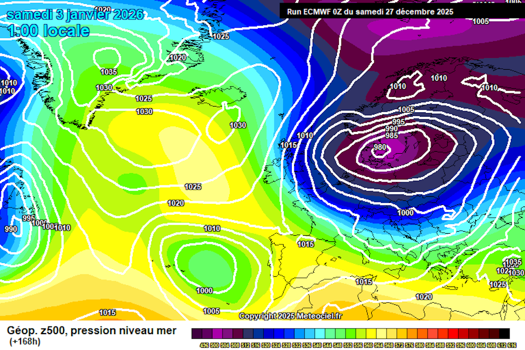 Cette prévision reste naturellement à confirmer, ainsi que le comportement de la dépression açorienne dont nous savons qu’elle a largement le pouvoir d’annihiler ce potentiel de temps hivernal dans notre région, en se plaçant plus au nord, en se creusant puis en aspirant vers elle l’air arctique, au nord de notre pays, nous exposant dès lors aux doux effluves tropicaux en provenance de l’Atlantique sud ou d’Espagne (exemple : début janvier 2025) . Ce risque n’apparaît pas pour l’instant dans les modélisations actuelles, espérons-le qu’il en restera ainsi ces prochains jours.
