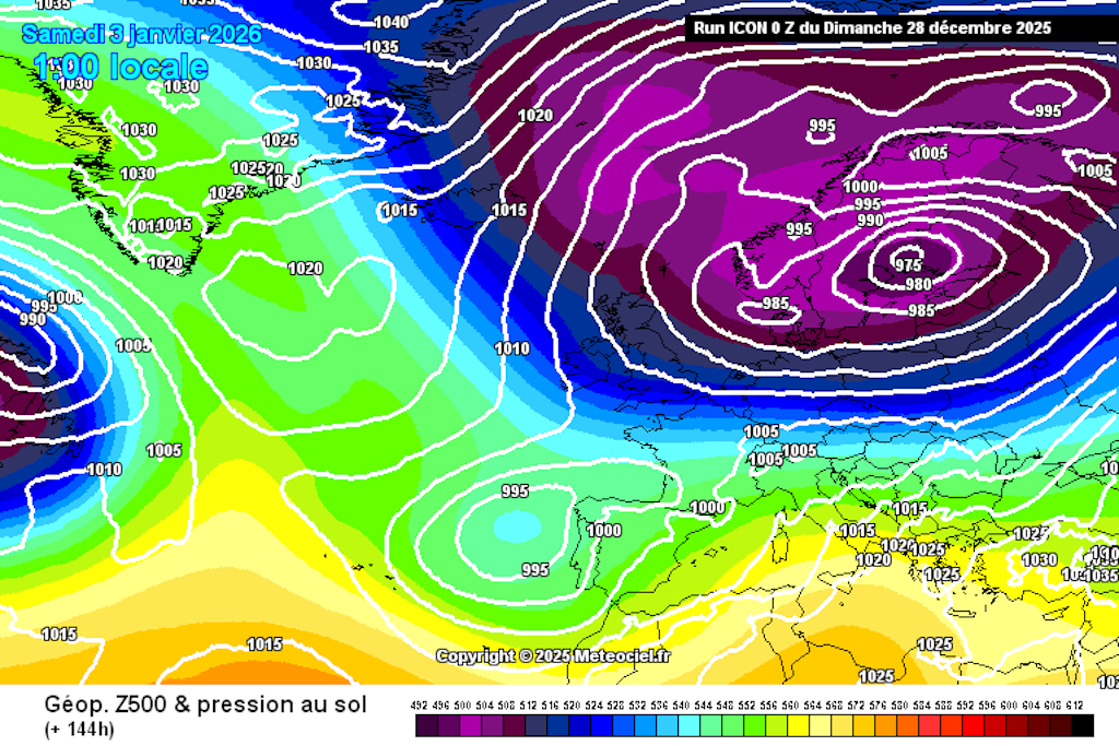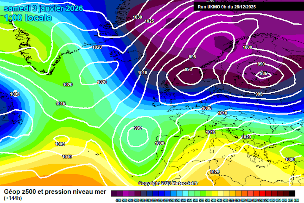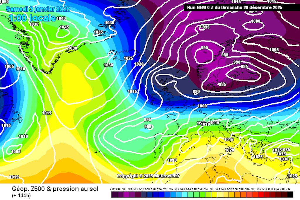 La tendance ultérieure pourrait consister à l’interaction entre le bloc polaire, situé sur le nord et l’est de l’Europe, et la dépression açorienne. Cette dernière pourrait en effet établir la jonction avec ce vaste système dépressionnaire. Il s’agirait donc de déterminer, dans le cas où cette interaction deviendrait effective, où et quand pourrait-elle s’effectuer, et quelles en seraient les conséquences sur le temps dans notre région. Sur ce point, des divergences apparaissent sur les modèles de prévision, ce qui est parfaitement normal à ces échéances et dans un tel contexte. Cependant, un épisode pluvieux, dans de l’air temporairement doux mais dont la durée reste encore à préciser, n’est pas improbable ici, avant le retour de conditions possiblement bien plus hivernales.